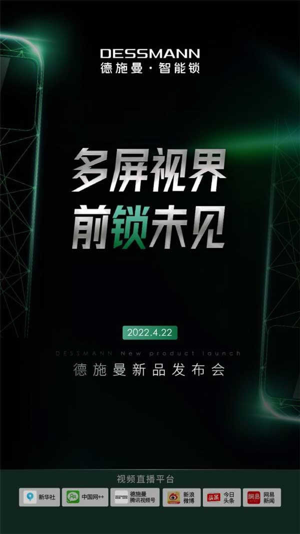 4月22日,德施曼“多屏視界 前鎖未見”2022新品發布會攜旗艦智能鎖Q50系列來襲,將潮流酷炫元素與前沿技術相融合,為全球家庭打造了更高端、全能的智慧守護者。新華社、中國網++、新浪微博、今日頭條、網易新聞等視頻直播平臺以及騰訊視頻號、抖音、天貓、京東等平臺官方賬號同步直播。