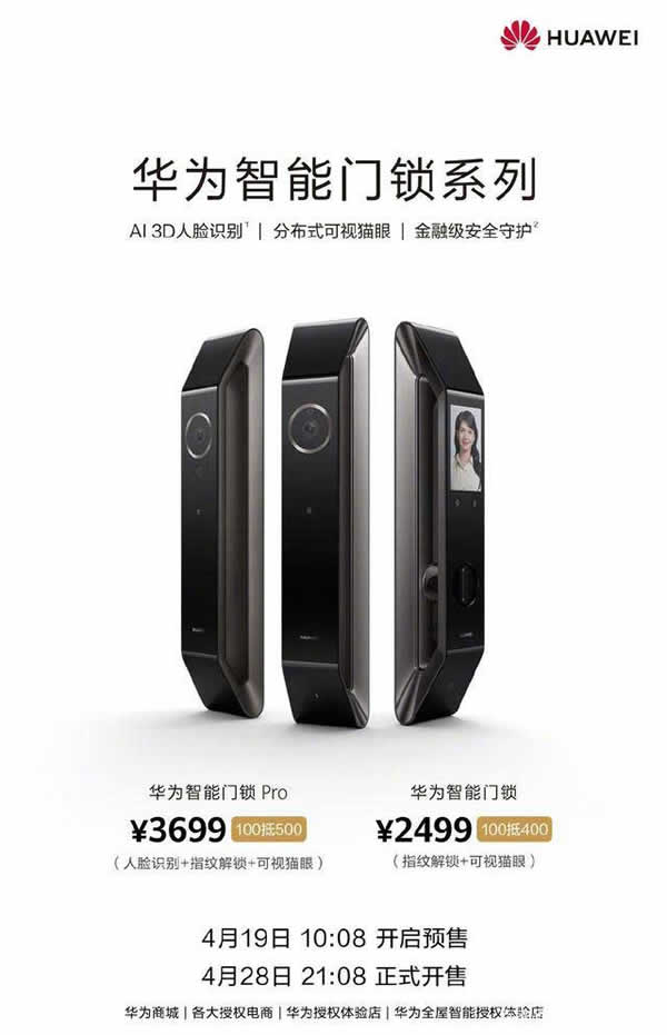 今天,該公司已開始接受這兩種設備的預訂。華為智能門鎖售價2,499元(約392美元),而Pro型號售價3,699元(約580美元)。產品現已可通過華為商城和京東預購,將于4月28日起在中國市場開售。