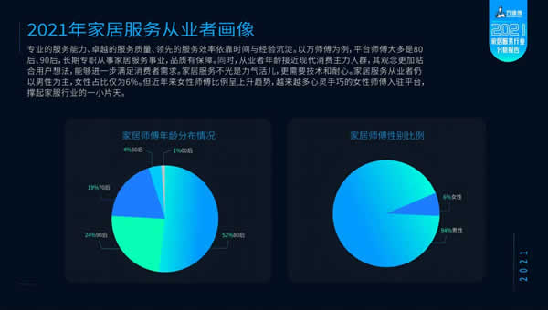 隨著移動互聯網的普及,越來越多家居服務者從線下走到了線上,將家居服務平臺作為主要收入渠道。平臺獨家數據顯示,在180萬注冊師傅中,90%的師傅長期專職從事家居服務行業,服務能力有保障。80后、90后師傅分別占比52%、24%,年齡接近如今主流消費群體,其觀念前衛,服務意識強。