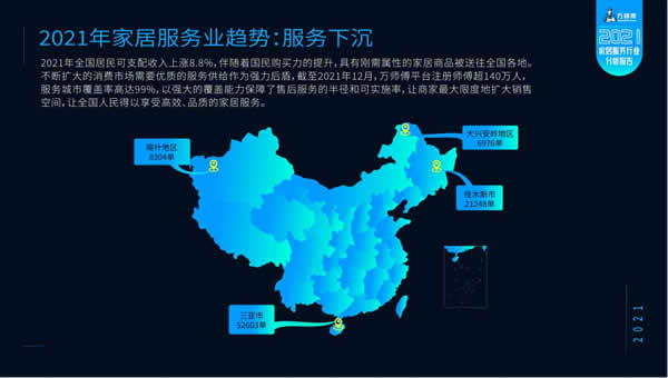 伴隨著居民可支配收入提升和市場下沉,家居商品通過互聯網流向全國各地。相對應地,家居服務市場活力持續釋放,服務需求以一線及新一線城市為中心向全國各地輻射,服務訂單較上年成倍增長。