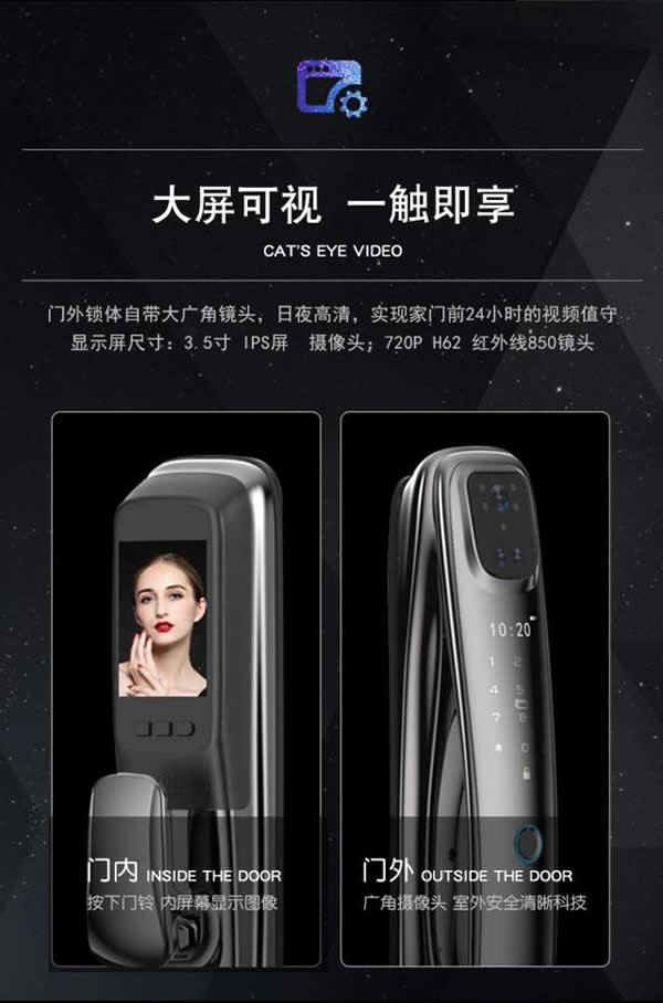1.祥云系列的智能鎖搭載了高清的攝像和顯示屏幕,使用者在家里就可以將外面的一切看的一清二楚。想要從外面打開房門的話,不需要再去掏鑰匙,只需要把自己的面部對(duì)著攝像頭掃描,智能系統(tǒng)會(huì)自動(dòng)分辨面部特征,并且和自己系統(tǒng)中的面部識(shí)別庫匹配,開鎖只需要一秒鐘。