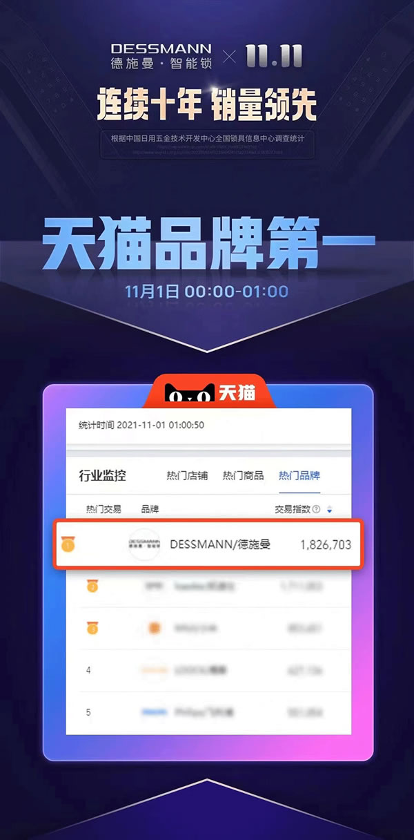 11月2日消息,截至11月1日1點,德施曼智能鎖交易指數居品牌第一。