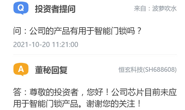 董秘回復:尊敬的投資者,您好!公司芯片目前未應用于智能門鎖產品,謝謝您的關注!