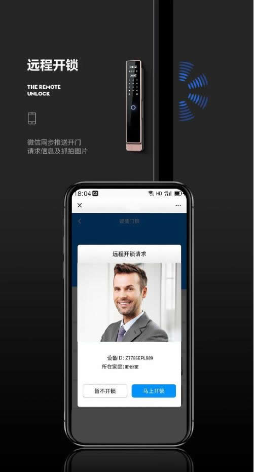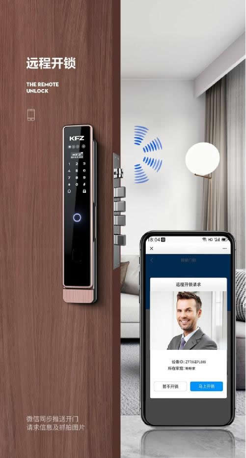 黑科技二:遠程可視對講、拍照錄像機遠程開鎖。K8007B除了3D人臉識別之外,還具備遠程可視功能,可以說它不僅是一款3D人臉識別智能鎖,同時也是一個遠程可視貓眼及門鈴產品——當有人按門鈴時,用戶通過手機即可進行遠程動態視頻直播及可視對講,在確認到訪者身份之后,還可以進行遠程開鎖。同時,可視功能還具備拍照及錄像功能,并可將照片推送至微信;此外,后面板還內置一塊4英寸的高清屏幕,可以通過這塊屏幕來查看門外的訪客。