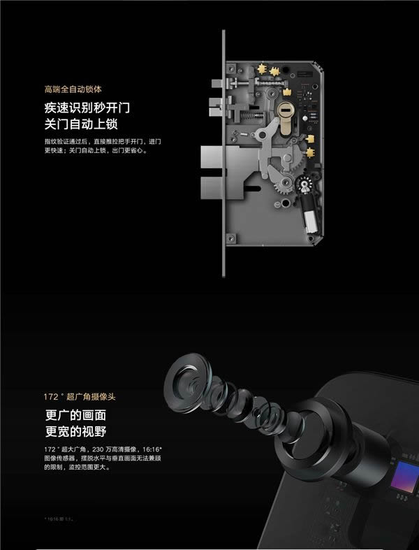 小米全自動智能門鎖Pro將貓眼和門鈴集成于智能鎖鎖體內,搭載了業內最大的172°超廣角攝像頭,而且能夠生成高達230萬像素的畫面,16:16的畫面比例能夠擺脫水平與垂直畫面難以兼顧的問題,監控范圍更大。而門鈴也同樣智能化,獨特的感應式門鈴在識別到門外來人之后,會主動喚醒亮起,在暗光環境下能夠更好地被訪客看到,使用頻次也會因此提高。