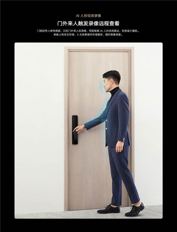 攝像頭使用頻率高了,但也難免會遇到異常情況。在遇到這些異常情況的時候,多數智能鎖采用的是抓拍功能,而小米全自動智能門鎖Pro采用智能AI偵測錄像,遇到這類情況會立即啟動錄像并且同步上傳至云存儲,搭配16:16圖像傳感器能夠有效減少漏拍缺拍,不錯過每一個異常畫面。