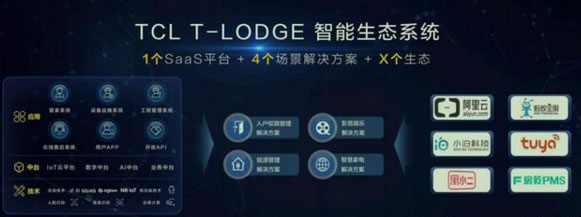 T-HOME場景化產品矩陣在深化落地的同時,TCL在AI×IoT戰略下的4T(T-HOME、T-LIFE、T-LODGE、T-PARK)場景化產品矩陣中的T-LODGE,在本次發布會也升級亮相。在經歷多年的探索和努力下,TCL利用自身的硬件優勢,以及用戶數據、服務運營等,自上而下構建了一套有自生基礎技術支持的智能家居生態系統。本次發布會上推出的“1個SaaS平臺+4個解決方案+X個生態”的智能家居應用體系,正是面向地產、家裝、公寓、酒店等To B市場落地的一套完整的場景及解決方案。