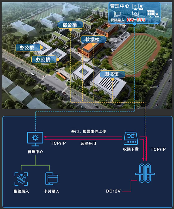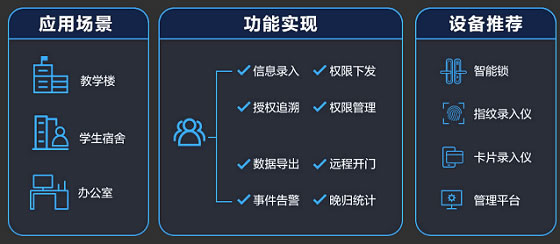 針對(duì)上述痛點(diǎn),螢石推出“校園智能鎖解決方案”實(shí)現(xiàn)對(duì)宿舍的智能化管理。將宿舍的傳統(tǒng)機(jī)械鎖更換為螢石智能門鎖,學(xué)生在管理中心錄入權(quán)限信息后,通過有線/無線通信協(xié)議將權(quán)限信息下發(fā)到智能鎖本地,最終實(shí)現(xiàn)授權(quán)追溯、權(quán)限管理、數(shù)據(jù)導(dǎo)出、遠(yuǎn)程開門、事件告警、晚歸統(tǒng)計(jì)等安全功能。
