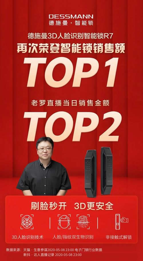 5月8日晚8點,智能鎖行業領軍品牌德施曼攜手新一代抖音帶貨一哥羅永浩,以德施曼3D人臉智能鎖R7為開場商品之一正式拉開了當晚直播帶貨的序幕。作為首次登陸在老羅直播間的智能鎖品牌,德施曼3D人臉智能鎖R7的出鏡,一度將