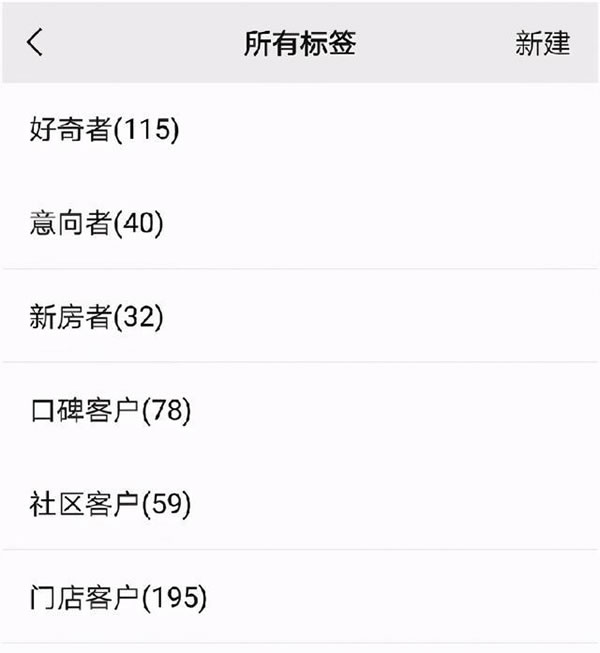 對于智能鎖銷售人員來說,朋友圈管理的本質就是給好友列表分類,進而針對性的展示信息。因此,銷售人員與顧客溝通的過程中,應獲得相應反饋,了解顧客潛在屬性,并以此為依據,進行標簽化設置管理。以下為標簽分組示例。
