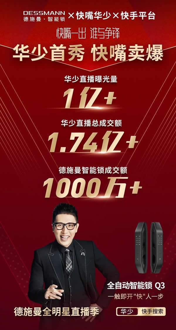 6月6日晚7點(diǎn),智能鎖領(lǐng)軍品牌德施曼攜手主持一哥快嘴華少、明星夫婦袁弘張歆藝,快手、抖音雙平臺(tái)直播首秀正式打響,德施曼爆品全自動(dòng)智能鎖Q3輪番“轟炸”兩大明星直播間,創(chuàng)下總曝光量破億、總銷售額破千萬(wàn)的智能鎖直播以來(lái)最佳紀(jì)錄,為德施曼品牌賺足了熱度,一時(shí)轟動(dòng)了整個(gè)行業(yè)內(nèi)外。