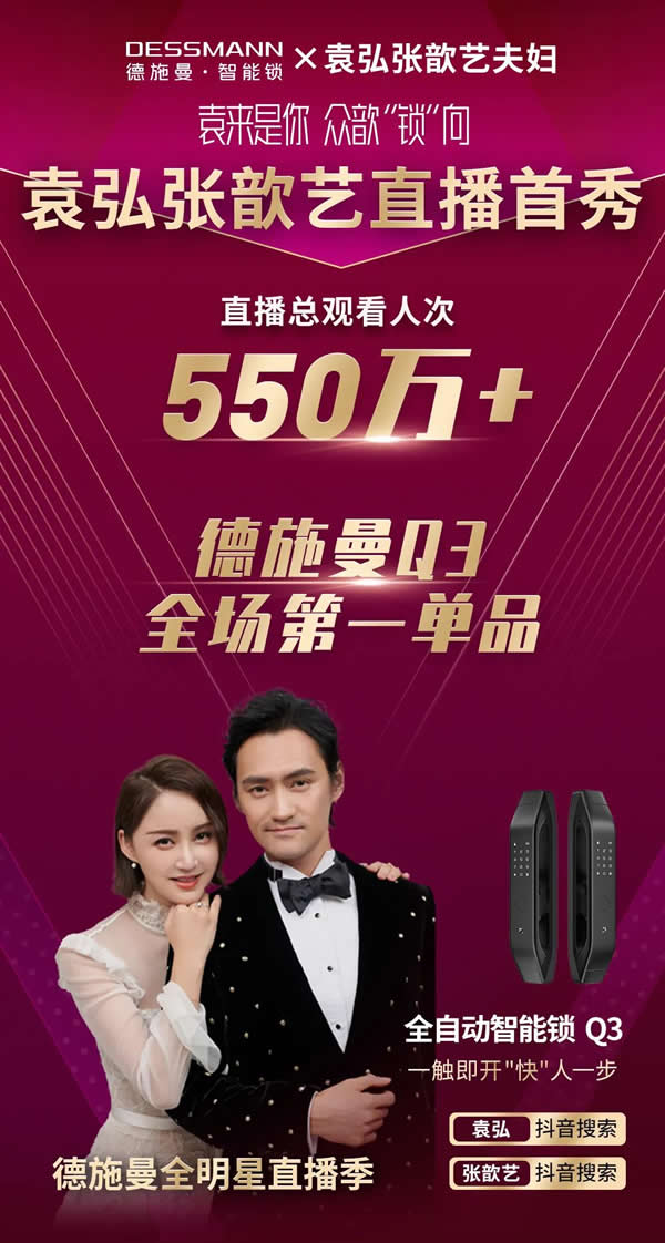 而明星夫婦袁弘張歆藝,在抖音直播間的高甜合體首秀,成績(jī)也十分不俗。作為甜蜜小家庭的代表推薦起美好生活必備的家居安防好物——德施曼全自動(dòng)智能鎖Q3,自是讓粉絲們紛紛感同身受,大呼過(guò)癮。