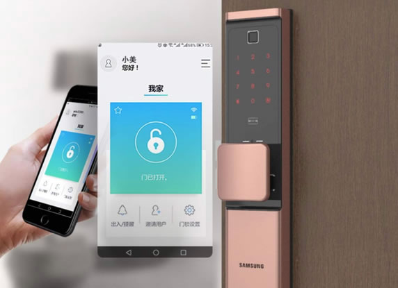 以三星智能鎖的物聯網型智能鎖DR700系列為例,該系列以物聯網服務為基礎,可與智能手機連接,提供包括手機APP/密碼認證/指紋認證/移動密鑰/應急鑰匙等多種開鎖方式。當你外出回家時,驗證身份后,即可自動解鎖,更加人性化的體驗讓你徹底告別繁冗的動作、輕松開門。當你上班或者出差時,剛好有親朋好友到訪,就可通過APP實現遠程操作和管理,提供便利的一次性臨時密碼,暫時幫你迎接客人。DR700系列還可提供安全到家推送提醒服務,你可以通過手機APP查看家人是否安全到家、何時出入等溫馨細節,省去了遠處的牽絆。