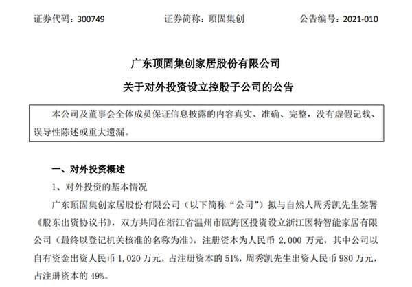 1月7日,頂固集創(300749.SZ)發公告稱,公司擬與自然人周秀凱先生簽署《股東出資協議書》,雙方共同在浙江省溫州市甌海區投資設立浙江因特智能家居有限公司(最終以登記機關核準的名稱為準),注冊資本為人民幣2000萬元,其中公司以自有資金出資人民幣1020萬元,占注冊資本的51%,周秀凱先生出資人民幣980萬元,占注冊資本的49%。