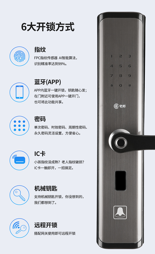 近日,宅邦推出年度旗艦智能鎖產品——HOME10,它擁有指紋、密碼、鑰匙,磁卡,藍牙,APP遠程開鎖等6大開鎖方式,采用C級鎖芯、真插芯,內置門鈴,指紋識別巧妙隱于把手,做到一握即開的流暢體驗。