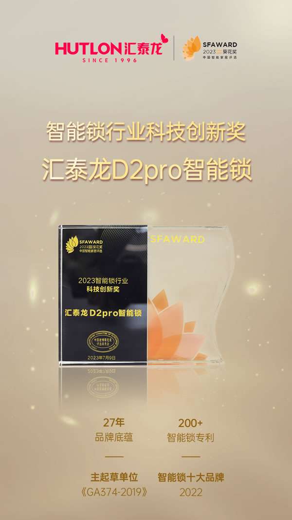 在專家評審、網絡票選等一致評定下,匯泰龍從眾多品牌中脫穎而出,榮獲“2023智能鎖行業消費者喜愛品牌”;匯泰龍D2pro智能鎖斬獲“2023智能鎖行業科技創新獎”;匯泰龍V3pro智能鎖贏得“2023智能鎖行業質量安全獎”。一舉攬獲三項大獎,匯泰龍光芒四射!